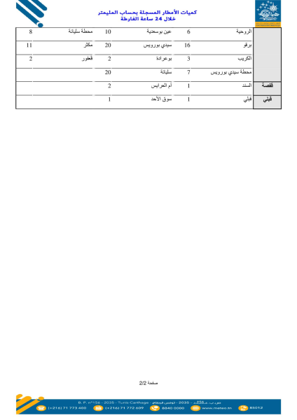 وطنية: نشر المعهد الوطني للرصد الجوي عن قائمة أولية لكمّيات الأمطار المسجّلة بحساب المليمتر خلال 24 ساعة الفارطة من الساعة 07:00 ليوم 25 سبتمبر إلى غاية الساعة 07:00 ليوم 26 سبتمبر 2024 : قراءة المزيد نشر المعهد الوطني للرصد الجوي عن قائمة أولية لكمّيات الأمطار المسجّلة بحساب المليمتر خلال 24 ساعة الفارطة من الساعة 07:00 ليوم 25 سبتمبر إلى غاية الساعة 07:00 ليوم 26 سبتمبر 2024 :أعلاها ببني مطير.. كميات الامطار المسجلة يوم 26 نوفمبركميات أمطار يوم 11 ماي 2025كميات امطار 5 ماي 2025المزيد من الأخبار