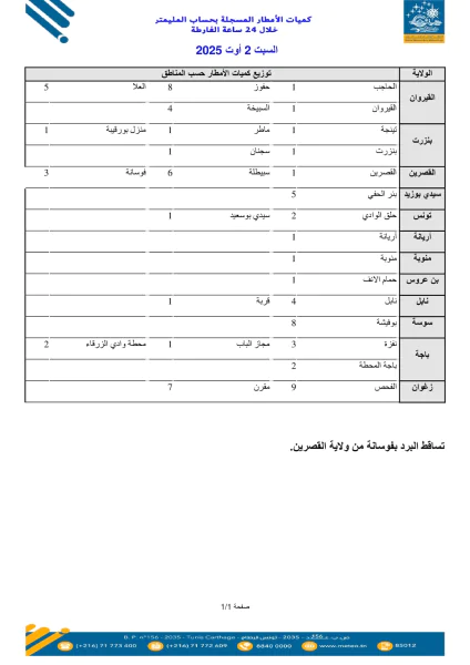 وطنية: نشر المعهد الوطني للرّصد الجوي، اليوم السبت 02 أوت 2025، قائمة كميات الأمطار المسجلة بعدد من المناطق خلال الـ 24 ساعة.