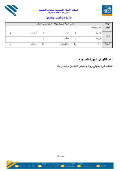 وفي مايلي كميات الامطار المسجلة بحساب المليمتر وحسب الجهات: ولاية تونس: سيدي بوسعيد 1 ولاية بنزرت: جومين 5// تينجة 1// العزيب 2// بنزرت 3//ماتلين 1 ولاية اريانة: رواد 13// سيدي ثابت 19//شرفش 2