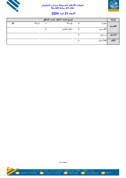 وطنية: سجلت مصالح الرصد الجوي خلال الساعات 24 المنقضية نزول كميات من الأمطار على عدّة مناطق كان أهمها بفريانة (35 مليمترا) من ولاية القصرين. قراءة المزيد سجلت مصالح الرصد الجوي خلال الساعات 24 المنقضية نزول كميات من الأمطار على عدّة مناطق كان أهمها بفريانة (35 مليمترا) من ولاية القصرين. وفي ما يلي كميات الأمطار المُسجلة:كميات الأمطار المسجلة يوم 9 نوفمبر 2025كميات الأمطار المسجلة يوم 2 نوفمبر 2025كميات الأمطار المسجلة يوم 19 أكتوبر 2025المزيد من الأخبار