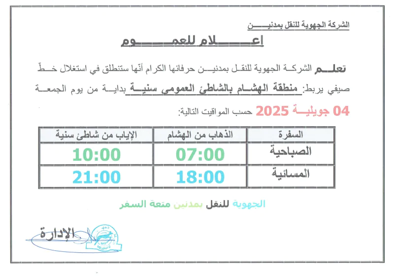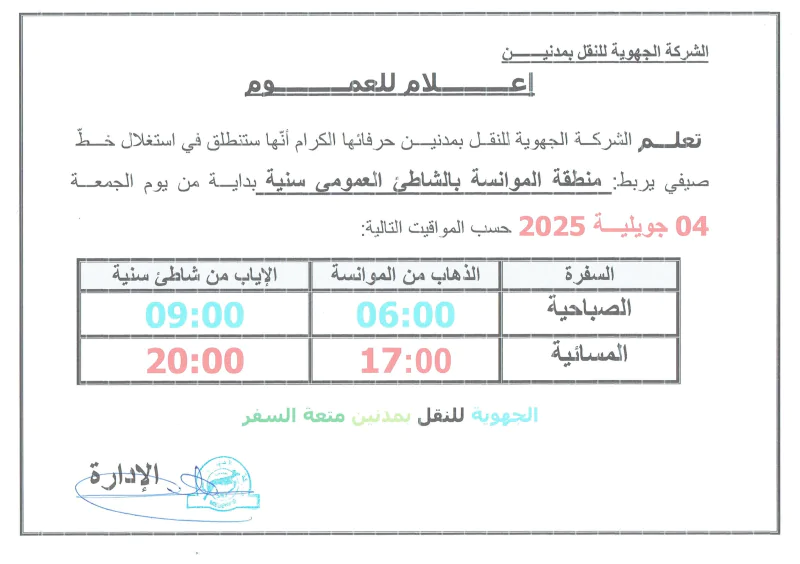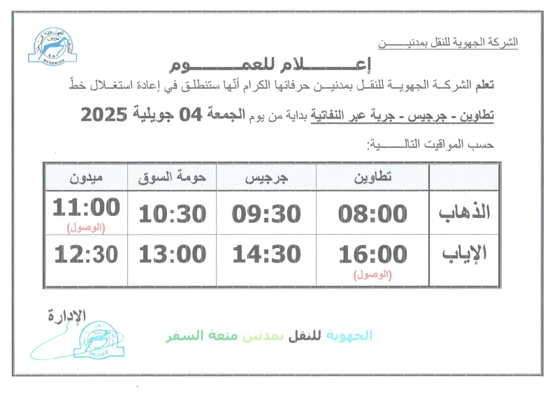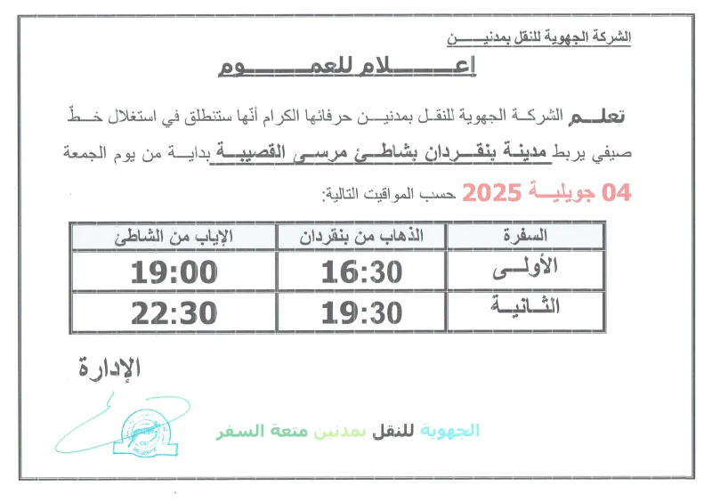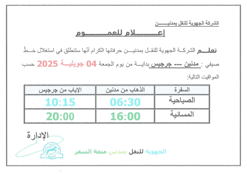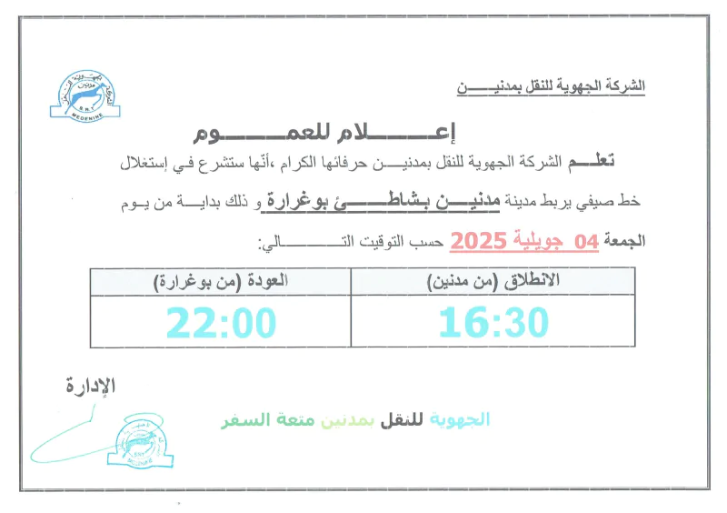 وطنية: أعلنت الشركة الجهوية للنقل بمدنين عن إحداث 5 خطوط نقل عمومي شاطئية صيفية لأهالي تطاوين ومدنين وذلك انطلاقا من يوم 4 جويلية 2025.