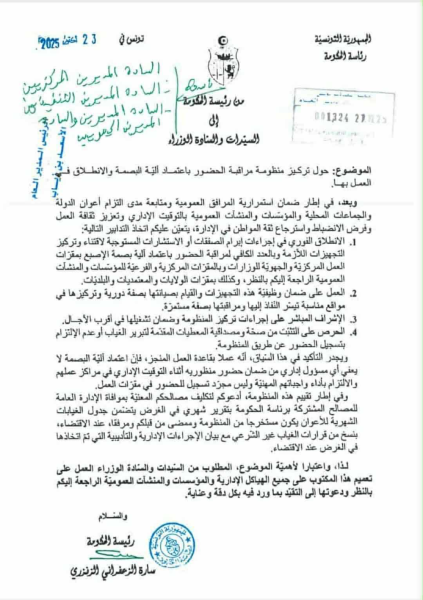 وطنية: أفادت رئيسة الحكومة سارة الزعفراني الزنزري في مراسلة إلى الوزراء حول تركيز منظومة مراقبة الحضور باعتماد آلية البصمة والانطلاق في العمل بها،