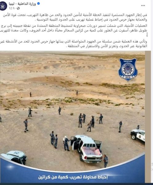 عالمية: أعلنت وزارة الداخلية الليبية عن إحباط عملية تهريب كمية كبيرة من السجائر مخبأة على الحدود الليبية التونسية. قراءة المزيد أعلنت وزارة الداخلية الليبية عن إحباط عملية تهريب كمية كبيرة من السجائر مخبأة على الحدود الليبية التونسية. وأضافت الوزارة أن قوة من الأمن والحماية بجهاز حرس الحدود، تمكنت خلال دورياتها الصحراوية لتمشيط المنطقة الممتدة من نقطة جبيبينه إلى برج طويل طاهر على الحدود مع تونس، من العثور على هذه الكمية.