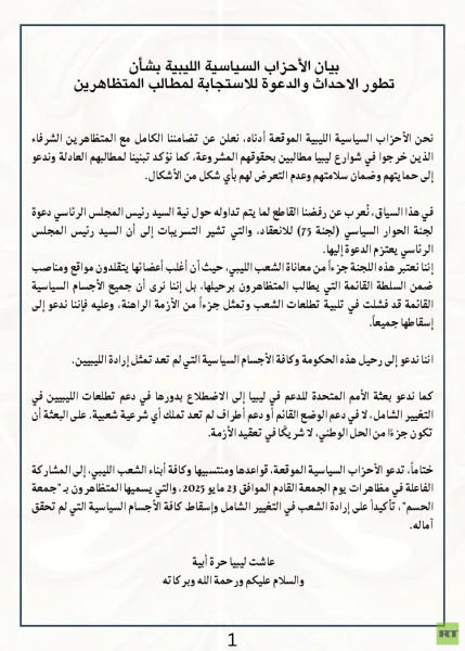 ودعت الأحزاب السياسية الموقعة على البيان أبناء الشعب الليبي للمشاركة الواسعة في مظاهرات “جمعة الحسم” المزمع تنظيمها في 23 ماي 2025، تأكيدا على المطالب الشعبية بإسقاط كافة الأجسام السياسية والدفع نحو مرحلة انتقالية جديدة تحقق تطلعات الليبيين.