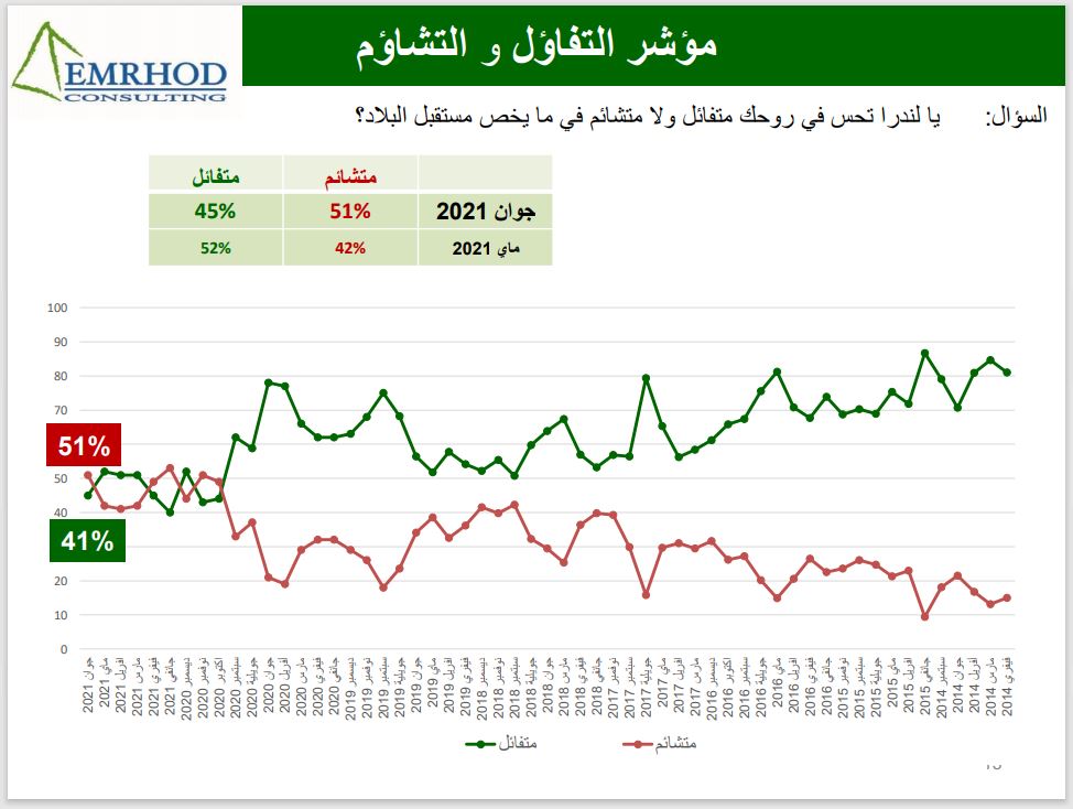 جاء في الباروميتر السياسي لمعهد “امرود كنسلتنغ” لشهر جوان 2021 أن 51 في المائة من المستجوبين أعربوا عن تشاؤمهم بخصوص مستقبل البلاد وكانت هذه النسبة في شهر ماي الماضي 42 في المائة أي بارتفاع بـ 9 نقاط.