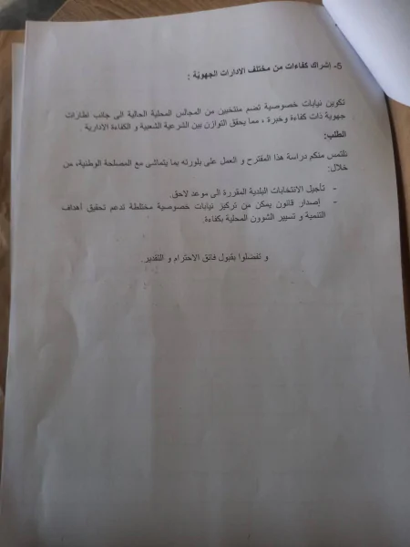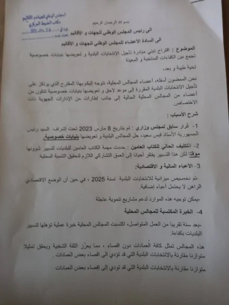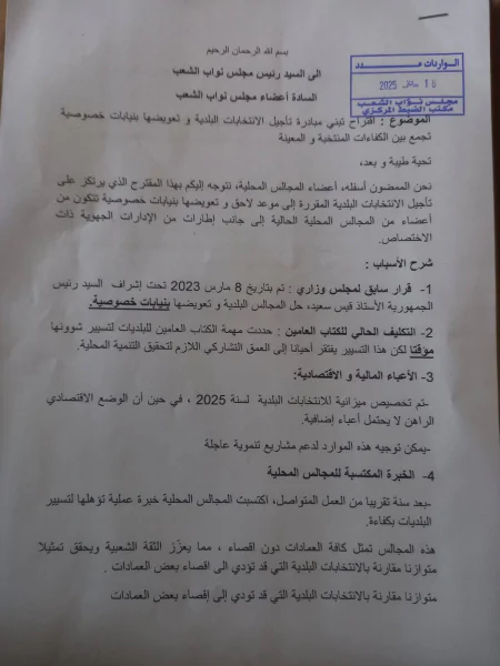وتمثل موضوع المبادة وفق ما تحصلت “تونس الان” عليه في إلغاء إنتخابات المجالس البلدية وتعويضها بنيابات خصوصية متكونة من أعضاء المجالس المحلية وإطارات من الإدارات الجهوية على اعتبار ان المجالس هي الأقرب للمواطن ويمكنها تسيير الشؤون المحلية بكفاءة وتحقيق أهداف التنمية.