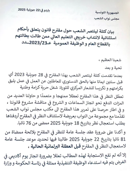 اعربت كتلة لينتصر الشعبصاحبة المبادرة الخاصة بتشغيل من طالت بطالتهم من خريجي التعليم العالي في بيان عن تمسكها بعقد جلسة عامة لعرض مبادرتها قبل العطلة البرلمانية أو عقد جلسة عامة استثنائية خلال العطلة.