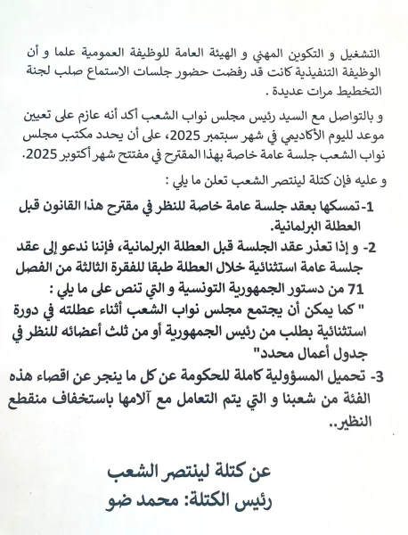 اعربت كتلة لينتصر الشعب صاحبة المبادرة الخاصة بتشغيل من طالت بطالتهم من خريجي التعليم العالي في بيان عن تمسكها بعقد جلسة عامة لعرض مبادرتها قبل العطلة البرلمانية أو عقد جلسة عامة استثنائية خلال العطلة.