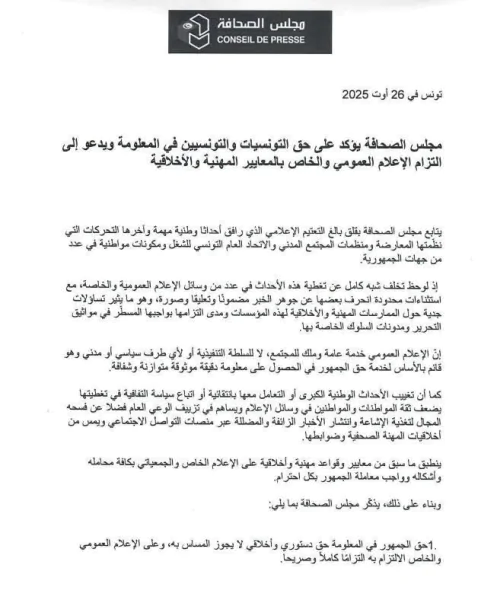 أكد مجلس الصحافة ضرورة الإسراع في إصلاح شامل وجريء لقطاع الإعلام بما يعزز استقلاليته وثقة الجمهور فيه، وفق بيان صادر عنه وأكد أن حق الجمهور في المعلومة حق دستوري وأخلاقي لا يجوز المساس به، وعلى الإعلام العمومي والخاص الالتزام به التزامًا كاملاً وصريحا مطالبا بضرورة احترام المعايير المهنية والموضوعية والأخلاقية في التغطية الإخبارية والإنتاجية واعتماد كل الأشكال الصحفية، بما يضمن تمثيل مختلف الآراء والوقائع بعيدًا عن الانتقائية.