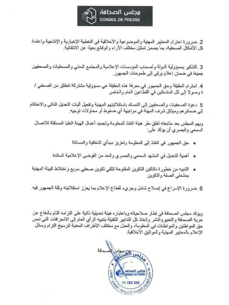 وذكّر المجلس بمسؤولية الدولة وأصحاب المؤسسات الإعلامية والمجتمع المدني والصحفيين في ضمان إعلام يرقى إلى طموحات الجمهور فضلا عن احترام الحقيقة موضحا أن حق الجمهور في معرفة الحقيقة هي مسؤولية مشتركة تنطلق من الصحفي وصولا إلى كل المتدخلين في القطاعين العام والخاص.