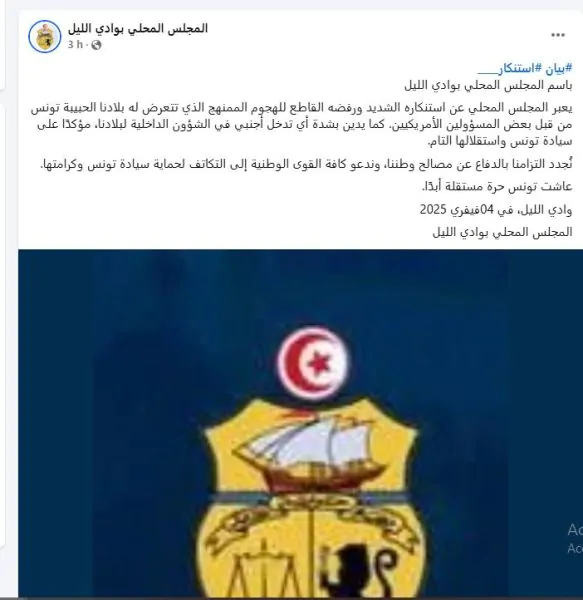 وطنية: عبر المجلس المحلي بوادي الليل عن" استنكاره الشديد ورفضه القاطع للهجوم الممنهج الذي تتعرض له تونس من قبل بعض المسؤولين الأمريكيين". قراءة المزيد عبر المجلس المحلي بوادي الليل عن” استنكاره الشديد ورفضه القاطع للهجوم الممنهج الذي تتعرض له تونس من قبل بعض المسؤولين الأمريكيين”. كما أدان بشدة “أي تدخل أجنبي في الشؤون الداخلية لبلادنا”،” مؤكدًا على “سيادة تونس واستقلالها التام”.مدرب قطر يطالب الفيفا بالتحقيق في مباراة تونس وفلسطينتونس تدعو الدول للوقوف أمام خرق الكيان الصهيوني للقانون الدوليبالأرقام.. عدد جرائم قتل النساء في تونس والجزائر والمغربالمزيد من الأخبار ويبدو أن المجلس المحلي بوادي الليل يقصد ببيانه النائب جو ويلسون، العضو الجمهوري في مجلس النواب الأمريكي الذي يشن في الايام الاخيرة حملة مسعورة على القيادة في تونس ضارب بتقاليد الديبلوماسية وسيادة الدول عرض الحائط.