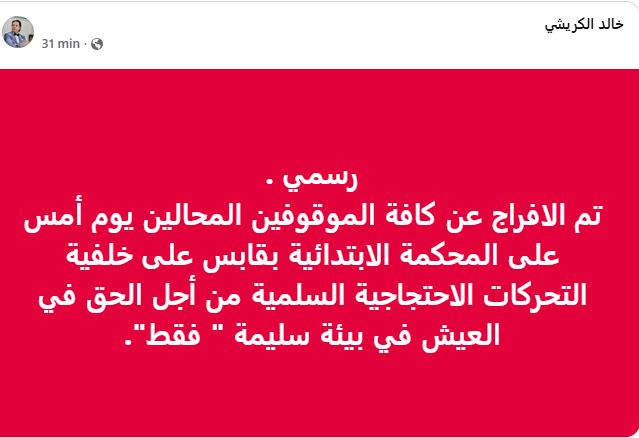 كشف المحامي خالد الكريشي انه تم اليوم الخميس 23 اكتوبر الافراج عن كافة الموقوفين المحالين يوم أمس على المحكمة الابتدائية بقابس على خلفية التحركات الاحتجاجية السلمية من أجل الحق في العيش في بيئة سليمة .