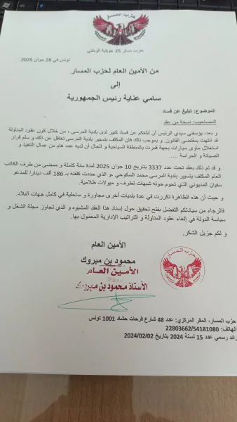 وطنية: كشف الأمين العام لحزب المسار محمود بن مبروك انه وجه مراسلة لرئيس الجمهورية حول "تواصل التجاوزات التي انتهجتها عدة إدارات وخرقها الواضح للقانون
