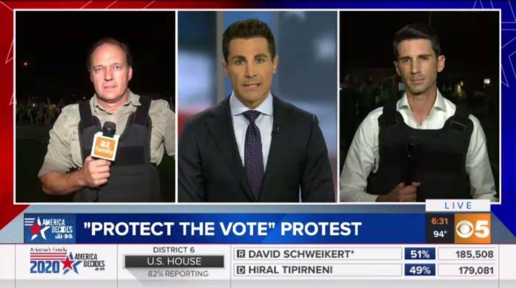 في ولاية أريزونا الأمريكية حيث التنافس على أشده بين المرشحين للانتخابات الرئاسية دونالد ترامب وجو بايدن يبدو أن إحدى القنوات التلفزية المحلية تتحسب لتطورات خطيرة ارتأت أن تفرض على مراسليها ارتداء سترات واقية للرصاص ..