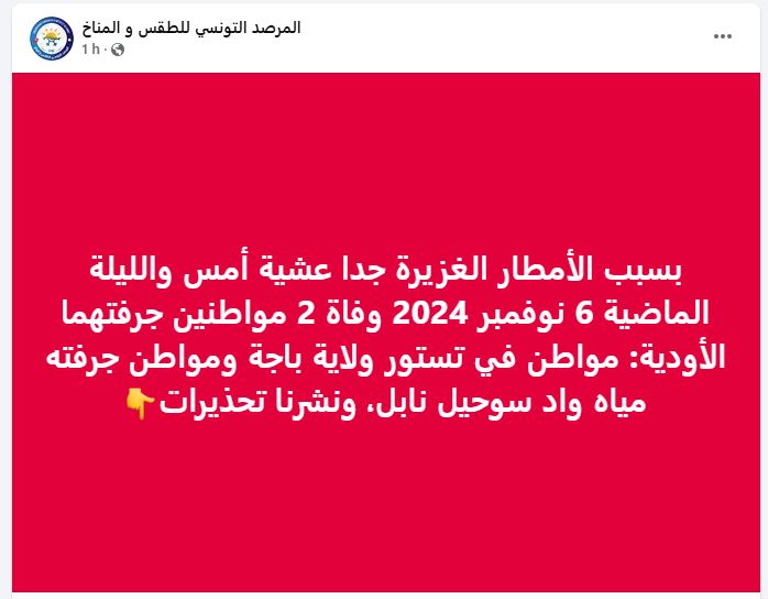 وطنية: كشف المرصد التونسي للمناخ والطقس اليوم الخميس 7 نوفمبر 2024 ، عن وفاة شخصان بسبب الأمطار الغزيرة جدا عشية أمس والليلة الماضية 6 نوفمبر 2024 . قراءة المزيد كشف المرصد التونسي للمناخ والطقس اليوم الخميس 7 نوفمبر 2024 ، عن وفاة شخصان بسبب الأمطار الغزيرة جدا عشية أمس والليلة الماضية 6 نوفمبر 2024 . وقال المرصد ان مواطنين جرفتهما الأودية ، مواطن في تستور ولاية باجة ومواطن جرفته مياه واد سوحيل نابلباجة.. توزيع مساعدات اجتماعية للعائلات المتضررة من البردباجة.. إيقاف الدروس بنفزة وعمدون بسبب الأحوال الجويةنابل.. تراجع بنسبة 60 بالمائة في الثروة السمكيةالمزيد من الأخبار