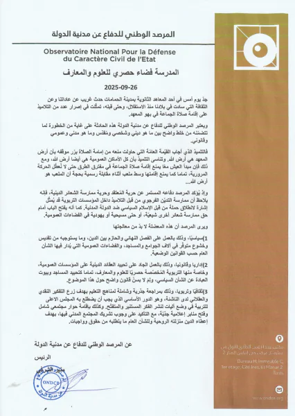 وطنية: نشر مرصد الدفاع عن مدنية الدولة بيانا قال فيه "جدّ يوم أمس في أحد المعاهد الثانوية بمدينة الحمامات حدث غريب عن عاداتنا وعن الثقافة التي سادت في بلادنا منذ الاستقلال، وحتى قبله، تمثّلت في إصرار عدد من التلاميذ على إقامة صلاة الجماعة في بهو المعه"د.