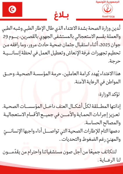 أدانت وزارة الصحة الاعتداء الذي طال الإطار الطبي وشبه الطبي والعملة بقسم الاستعجالي بالمستشفى الجهوي بالقصرين، يوم 29 جوان 2025، أثناء استقبال جثمان ضحية حادث مرور، وما رافقه من تحطيم تجهيزات غرفة الإنعاش وتعطيل العمل في لحظة إنسانية حرجة، حسب بلاغ صادر عنها