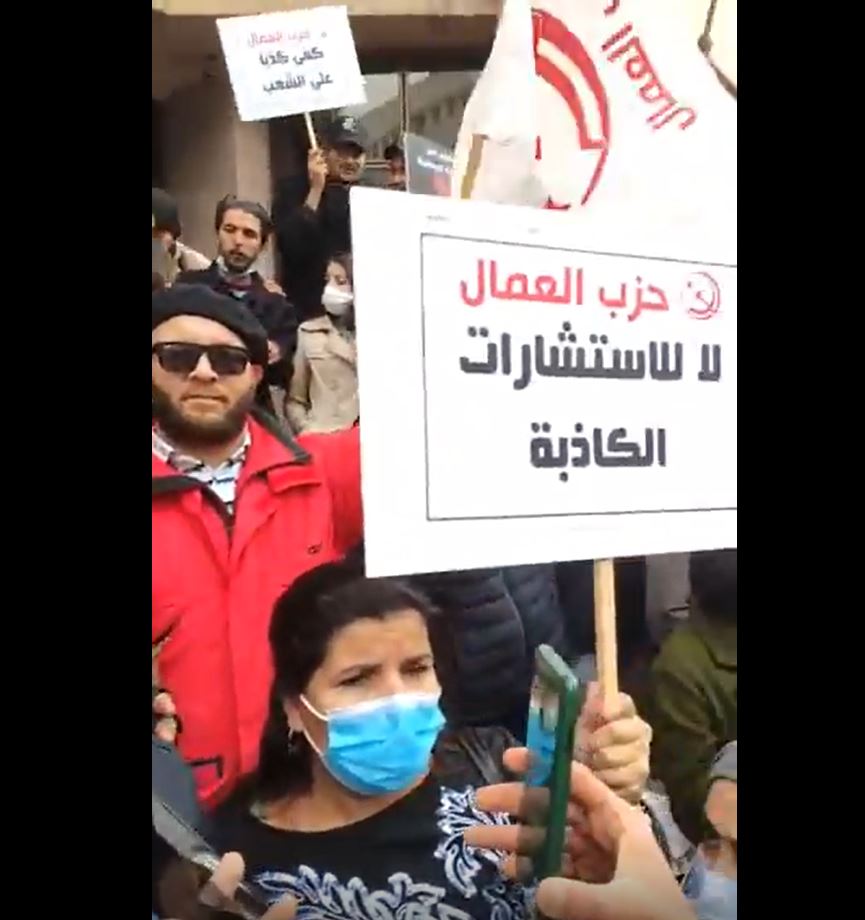 ورفع أنصار حزب العمال شعارات ضد رئيس الجمهورية قيس سعيد وضد المنظومة السابقة لما قبل 25 جويلية.