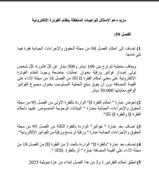 وطنية: يتجه مشروع قانون المالية لسنة 2025 الى مزيد دعم الامتثال للواجبات المتعلقة بنظام الفوترة الالكترونية وذلك من خلال سنّ عقوبات جبائية جزائية على المخالفات المرتكبة بهذا العنوان وملاءمة نظام الفوترة الإلكترونية مع نظام الفوترة الورقية