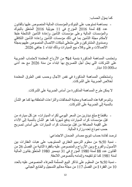 وطنية: نصّ مشروع قانون المالية لسنة 2026 على اقتطاع مبلغ دينارين من السعر اليومي لكراء السيارات ، عن كل سيارة ، من قبل مؤسسات كراء السيارات يدفع شهريا كما هو الشأن بالنسبة الى الأداء على القيمة المضافة من قبل مؤسسات كراء السيارات