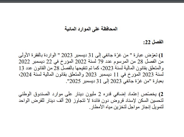 اقترح مشروع قانون المالية لسنة 2025 ، للمحافظة على الموارد المائية التالي : الفصل :22 1 تعوض عبارة ” من غرة جانفي إلى 31 ديسمبر 2023 ” الواردة بالفقرة الاولى من الفصل 28 من المرسوم عدد 79 لسنة 2022 المؤرخ في 22 ديسمبر 2022 والمتعلق بقانون المالية لسنة ،2023 كما تم تنقيحها بالفصل 28 من القانون عدد 13 لسنة 2023 المؤرخ في 11 ديسمبر 2023 والمتعلق بقانون المالية لسنة ،2024 بعبارة “من غرة جانفي 2023 إلى 31 ديسمبر 2025”. 2 يخصص إعتماد إضافي قدره 2 مليون دينار على موارد الصندوق الوطني لتحسين السكن اسناد قروض دون فائدة ال تتجاوز 20 ألف دينار للقرض الواحد لتمويل إنجاز مواجل لتخزين مياه الأمطار.