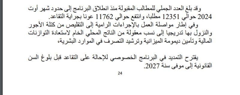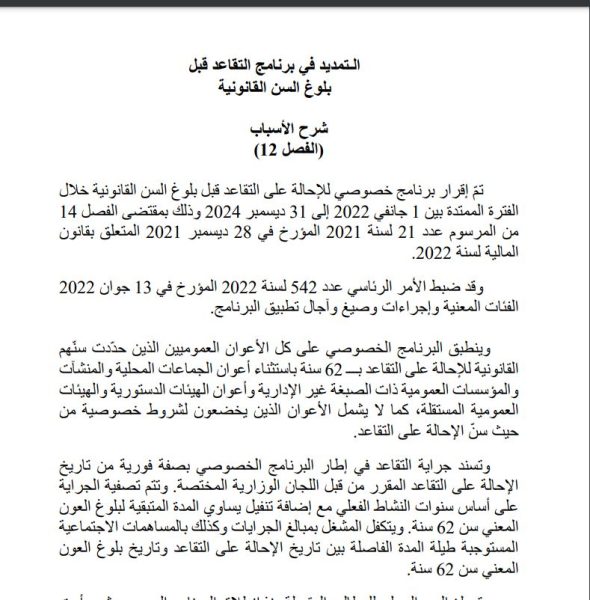 ونص الفصل 12 منمشروع القانون على انه “يتواصل العمل باحكام الفصل 14 من المرسوم عدد 21 لسنة 2021 المتعلق بقانون المالية لسنة 2022 حسب نفس الشروط والاجراءات والصيغ المنصوص عليها بالتراتيب الجاري بها العمل وذلك خلال الفترة الممتدة من 1 جانفي 2025 الى 31 ديسمبر 2027”.
