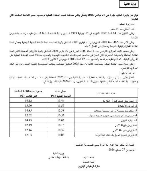 وطنية: نشر معدلات نسب الفائدة الفعلية وبحدود نسب الفائدة المشطة التي تقابلها. قراءة المزيد صدر قرار بالرائد الرسمي للجمهورية التونسية من وزيرة المالية ويبتعلق بنشر معدلات نسب الفائدة الفعلية وبحدود نسب الفائدة المشطة التي تقابلها. وفي ما يلي معدل نسبة الفائدة الفعلية للسداسية الثانية من عام 2025 والتي تقابلها من الفترة ذاتها لعام 2026:باجة/ تعليق الدروس في نفزة وعمدونزوجة ليفاندوفسكي تصدم جمهور برشلونةوزارة الفلاحة تدعو البحّارة والفلاحين إلى الحيطة والحذرالمزيد من الأخبار