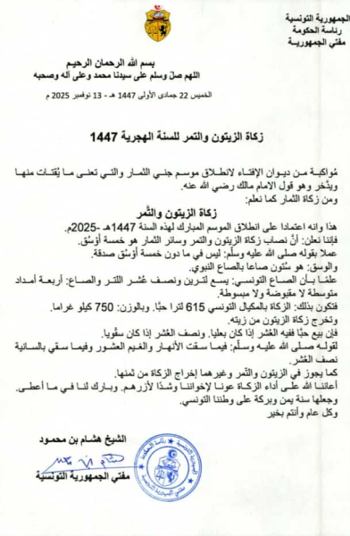 وطنية: أعلن مفتي الجمهورية هشام بن محمود، أن نصاب زكاة الزيتون والتمر وسائر الثمار للسنة الهجرية 1447، هو 5 أَوْسق، وذلك عملا بقوله صلى الله عليه وسلّم "ليس في ما دون خمسة أوسق صدقة"، والوسق هو ستون صاعا بالصاع النبوي.