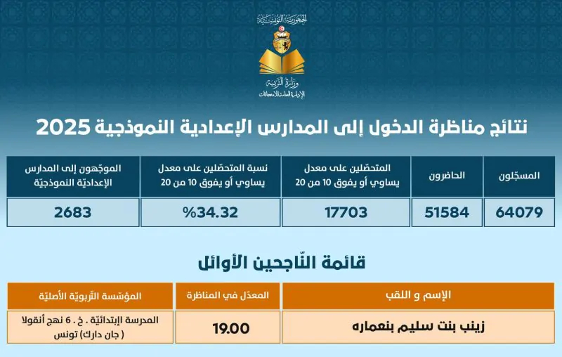 أعلنت وزارة التربية، اليوم الاثنين، عن نتائج مناظرة الدخول إلى المدارس الإعدادية النموذجية لسنة 2025 (السيزيام)، حيث بلغ عدد الموجهين إلى المدارس الإعدادية النموذجية 2683 تلميذا.