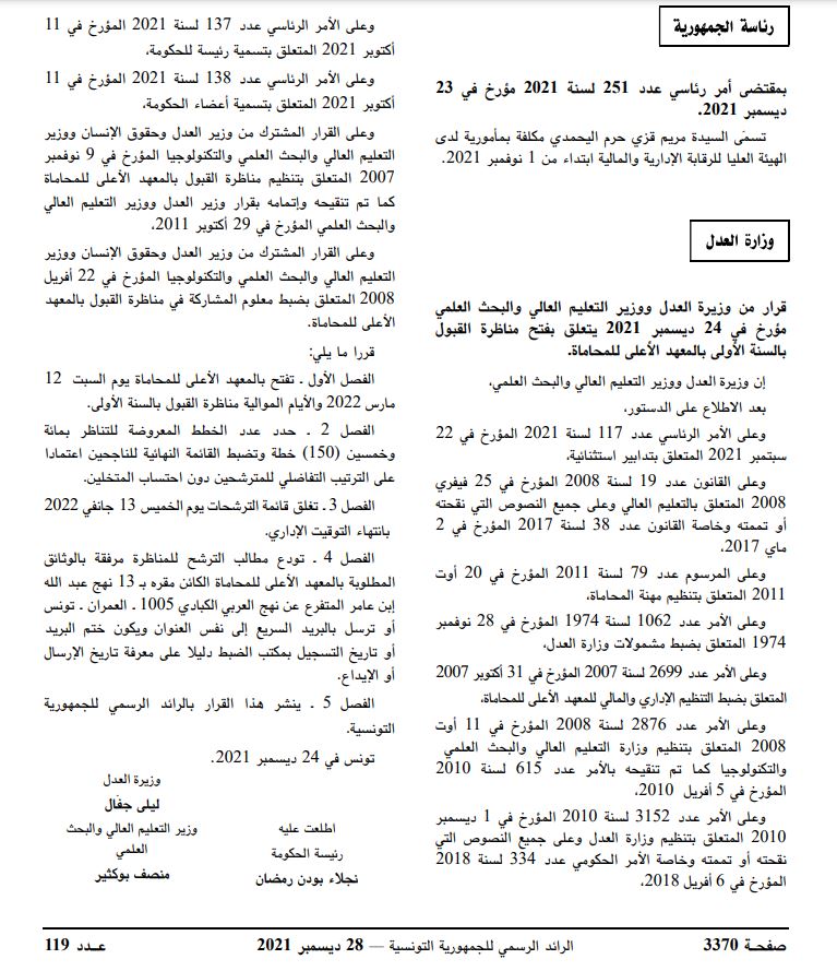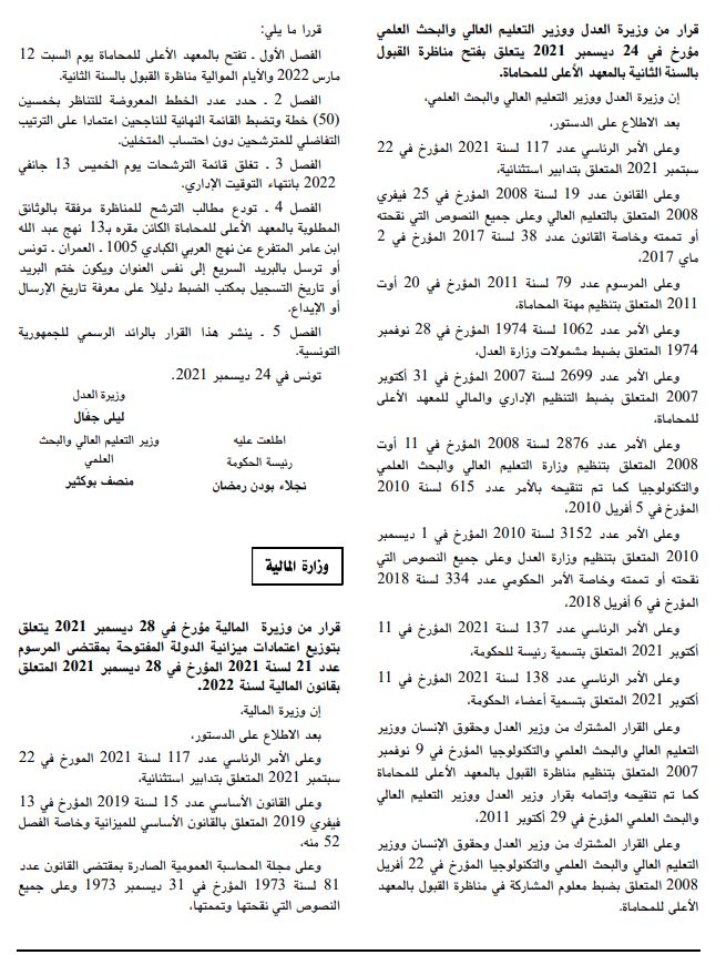 صدر في العدد الأخير من الرائد الرسمي قرار من وزيرة العدل ووزير التعليم العالي والبحث العلمي مؤرخ في 24 ديسمبر 2021 يتعلق بفتح مناظرة القبول بالسنة الأولى بالمعهد الأعلى للمحاماة.