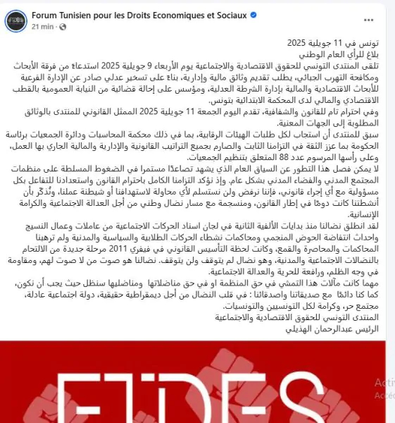أعلن المنتدى التونسي للحقوق الاقتصادية والاجتماعية تلقيه، يوم الأربعاء 9 جويلية 2025، استدعاءً من فرقة الأبحاث ومكافحة التهرب الجبائي، يطلب تقديم وثائق مالية وإدارية