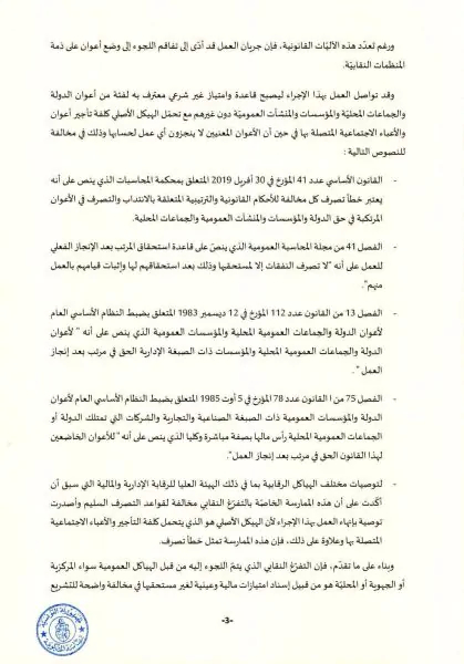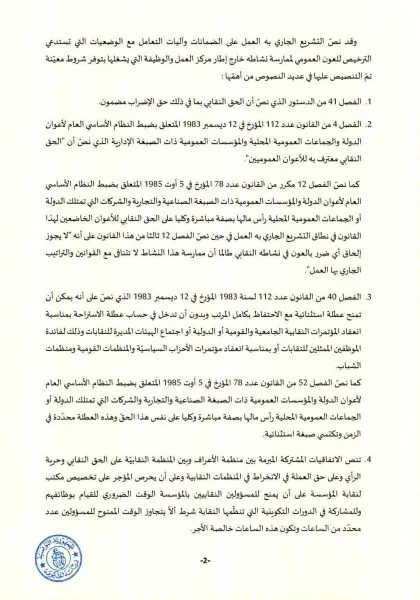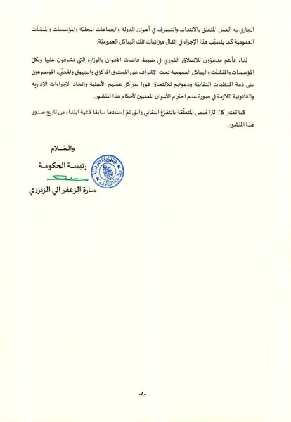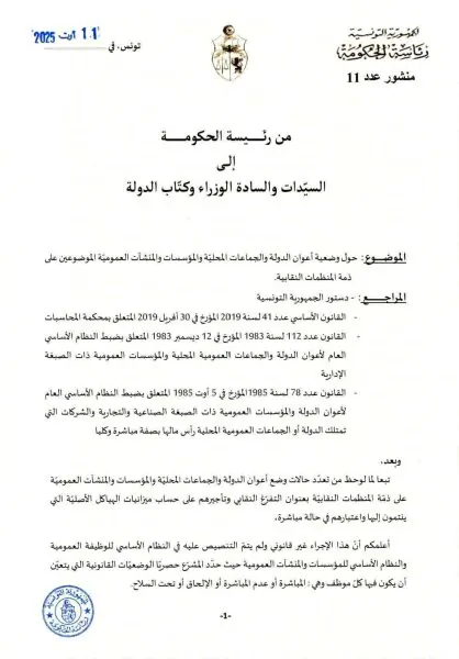 في منشور إلى الوزراء وكتاب الدولة، أكدت رئاسة الحكومة أنه تبعا لما تم ملاحظته من تعدد حالات وضع أعوان والجماعات المحلية والمؤسسات والمنشآت العمومية على ذمة المنظمات النقابية تحت عنون التفرغ النقابي وتأجيرهم على حساب ميزانية الهياكل الأصلية التي ينتمون إليها واعتبارهم في حالة مباشرة.