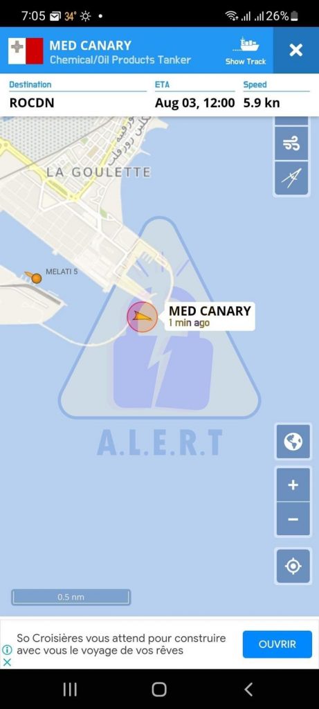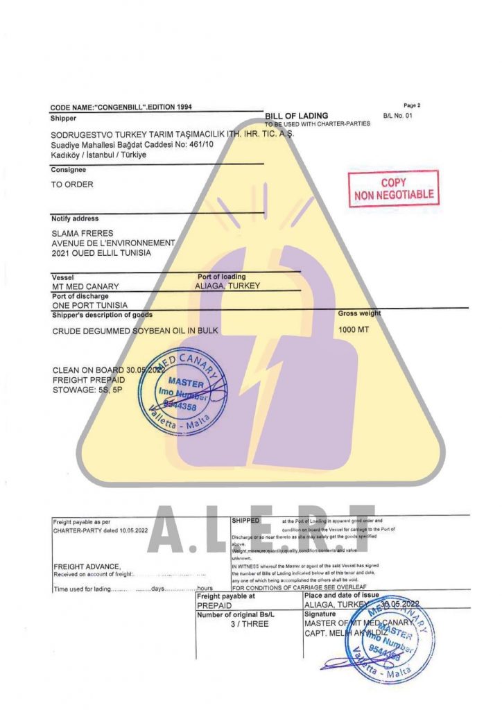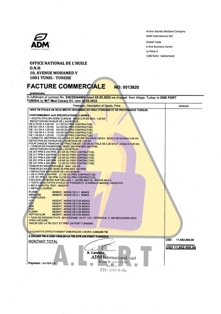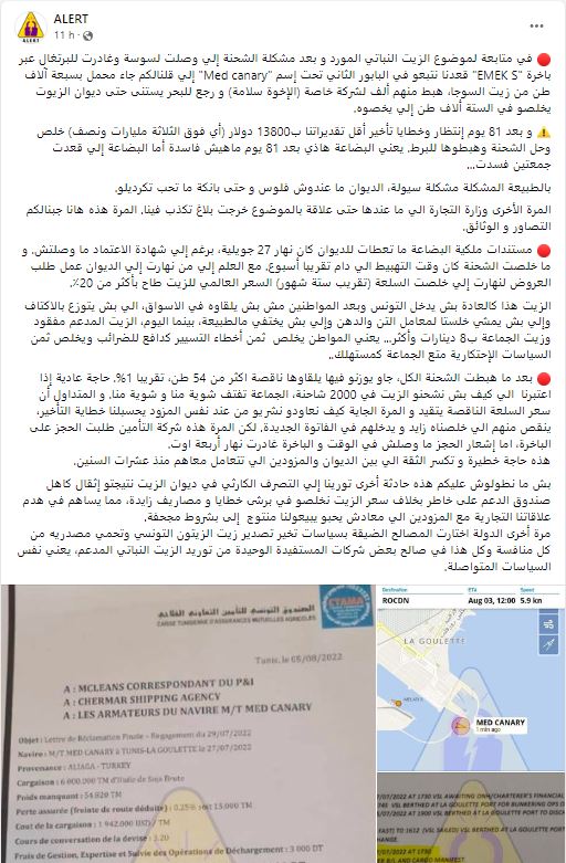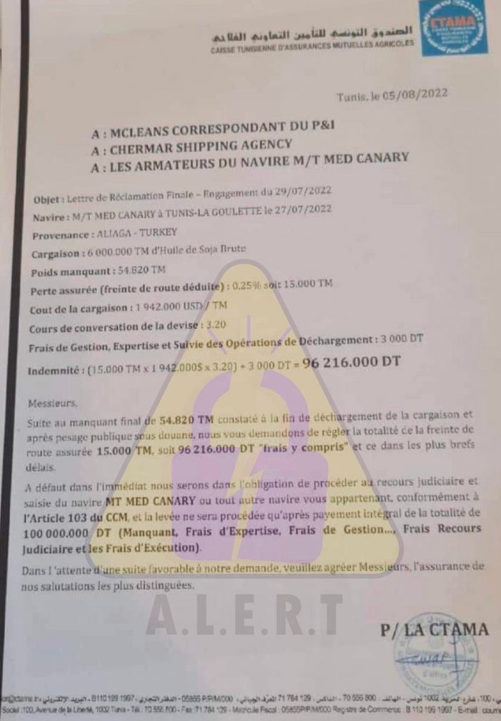 وأشارت المنظمة إلى أنها ظلت تتابع منذ ذلك التاريخ باخرة ثانية تحت إسم “Med canary” قالت إنها كانت محمّلة بسبعة آلاف طن من زيت الصوجا، قامت بتفريخ ألف طن منها لفائدة شركة خاصة (الإخوة سلامة) قبل أن تعود الباخرة إلى البحر في إنتظار تمكن ديوان الزيت من تأمين مستحقاتها في سعر الستة آلاف طن المتبقية والتي تعود إليه.