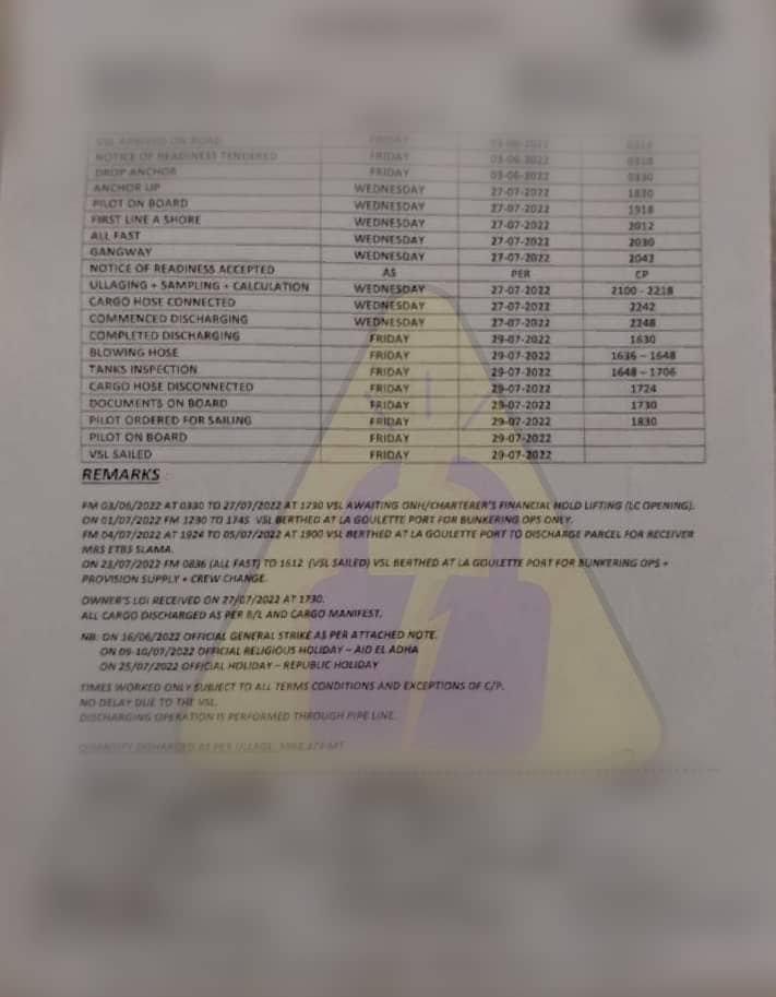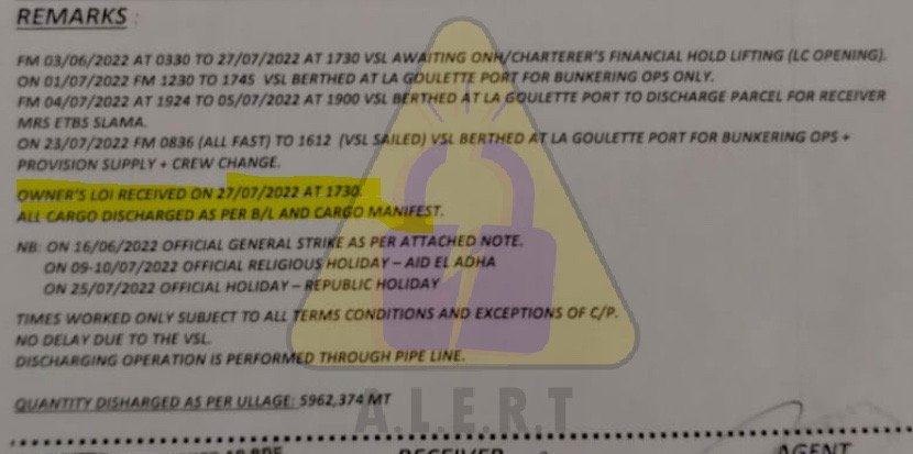 وأضافت أن الباخرة المذكورة ظلّت تنتظر في البحر 81 يوما هو ما كبّد تونس خطايا تأخير تقدّر بأكثر من 3.5 ملايين دينار أي بمعدّل 43 ألف دينار يوميا، ثم تم خلاص الشحنة وتفريعها في الميناء.