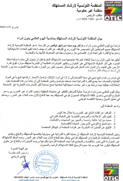 تزامنا مع اليوم العالمي بدون شراء وهو اخر يوم من شهر نوفمبر من سنة دعن المنظمة التونسية لارشاد المستهلك جميع المواطنين الى تخصيص هذا اليوم الرمزي للتوقف عن الشراء بهدغ اعادة تقييم العادات الاستهلاكية واسترجاع القدرة على اتخاذ قرار اقتصادي حر مسؤول بعيدا عن الضغوط الانتهازية والتجارية