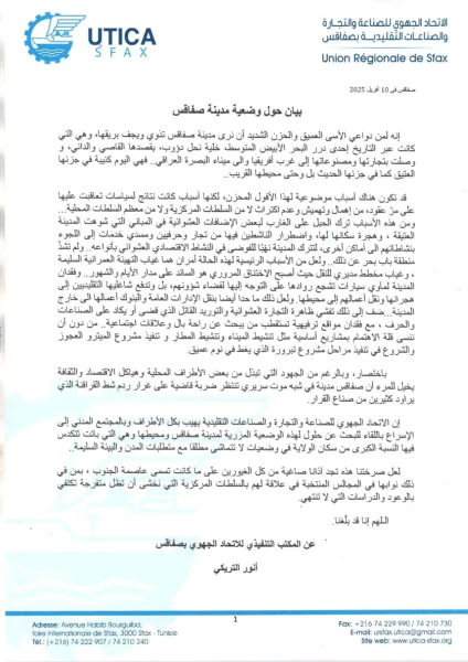 ندد الاتحاد الجهوي للتجارة والصناعة والصناعات التقليدية بصفاقس في بلاغ له اليوم خميس 10 أفريل 2025 بالحالة الكارثية التي تردت إليها عاصمة الجنوب