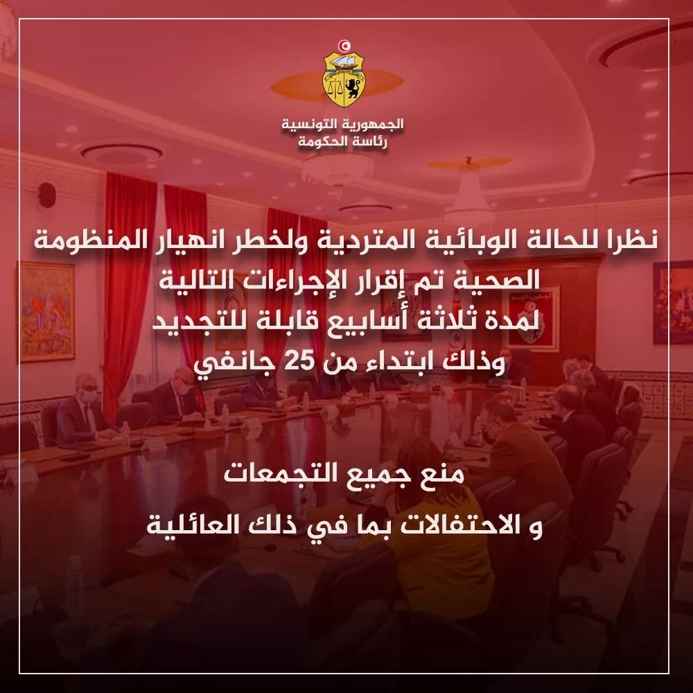 أعلنت وزارة الشؤون المحلية والبيئة، أنه تقرر منع جميع التجمعات والاحتفالات بما في ذلك العائلية، بداية من اليوم الإثنين 25 جانفي 2021 وذلك لمدة 3 أسابيع قابلة للتمديد.