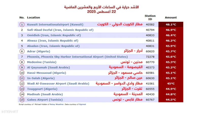 عالمية: صنف موقع دولي مختص في درجات الحرارة، اليوم الجمعة، 10 مناطق ومدن عربية ضمن قائمة المدن الأشد حرارة على مستوى العالم خلال الساعات الأربع والعشرين الماضية.