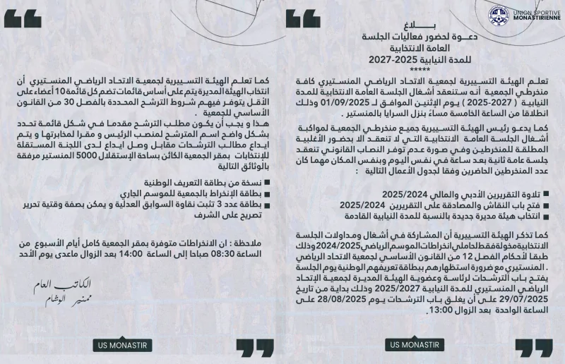 أعلنت الهيئة التسييرية للاتحاد الرياضي المنستيري، في بلاغ صادر اليوم الإثنين 28 جويلية 2025، عن دعوة كافة المنخرطين لحضور الجلسة العامة الانتخابية التي ستُعقد يوم الإثنين 1 سبتمبر 2025، انطلاقًا من الساعة الخامسة مساءً.