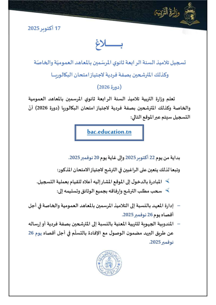 أعلنت وزارة التربية فتح باب تسجيل تلاميذ السنة الرابعة ثانوي المرسمين بالمعاهد العمومية والخاصة وكذلك المترشحين بصفة فردية لاجتياز امتحان البكالوريا دورة 2026