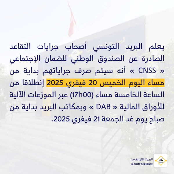 وطنية: اعلن البريد التونسي ان إنطلاق صرف جرايات التقاعد الصادرة عن الصندوق الوطني للضمان الإجتماعي « CNSS »