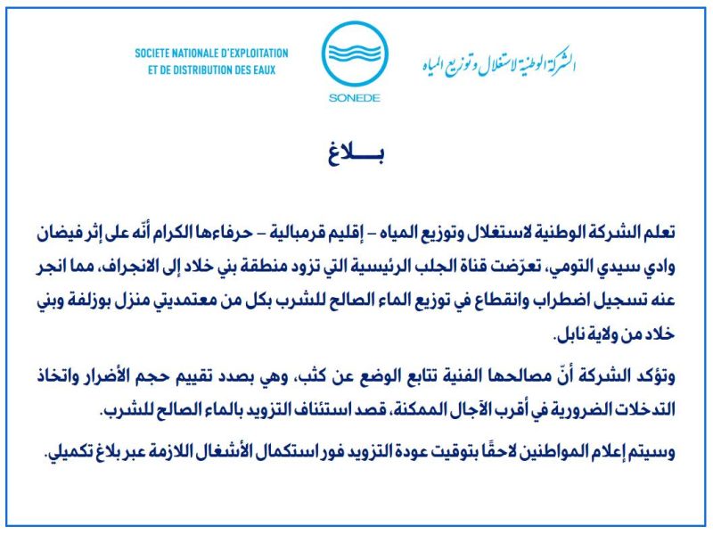 أفادت الشركة الوطنية لاستغلال وتوزيع المياه – إقليم قرمبالية بأن قناة الجلب الرئيسية التي تزود منطقة بني خلاد تعرضت للانجراف على إثر فيضان وادي سيدي التومي، ما أدى إلى اضطراب وانقطاع في توزيع الماء الصالح للشرب بكامل معتمديات بني خلاد ومنزل بوزلفة بولاية نابل.