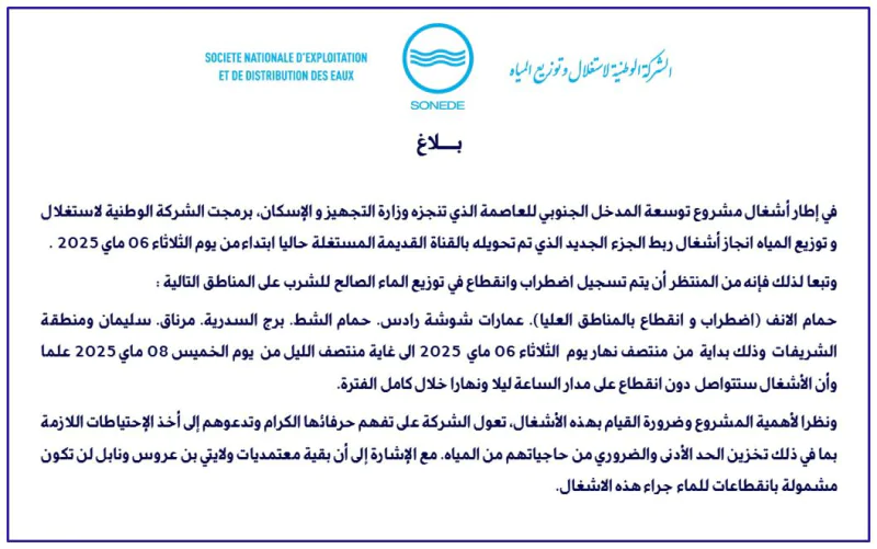 وطنية: أعلنت الشركة الوطنية لاستغلال وتوزيع المياه أنّه سيتمّ تسجيل اضطراب وانقطاع في توزيع الماء الصالح للشرب بداية من منتصف نهار يوم الثلاثاء 06 ماي 2025 إلى غاية منتصف الليل من يوم الخميس 08 ماي 2025 بعدد من المناطق التابعة لولايتي نابل وبن عروس.