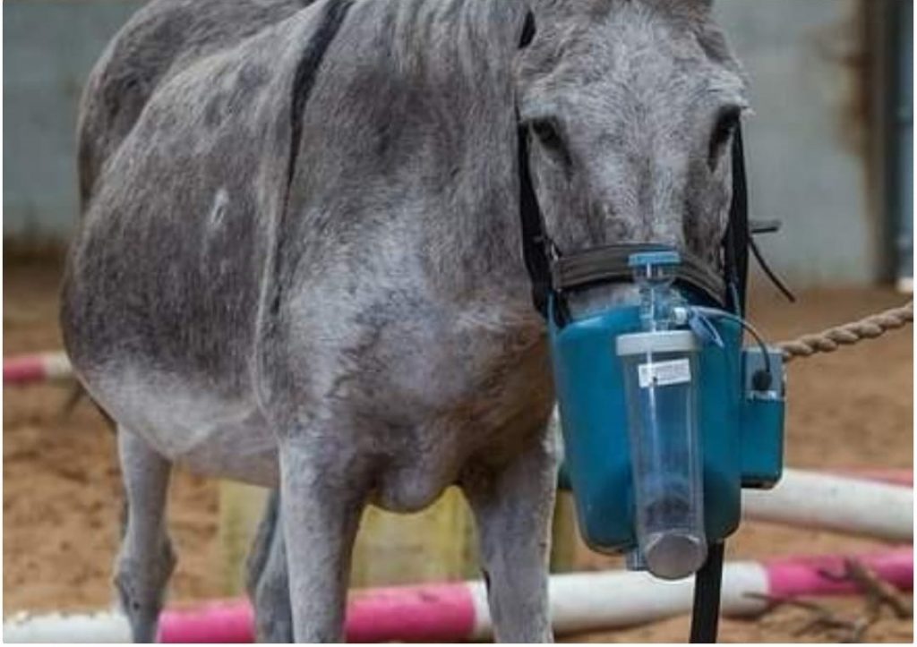 في الصورة أدناه، داخل مؤسسة “Flicka Fondation” الخيرية للرفق بالحيوان في بريطانيا، من أجل إنقاذ حياة حمار يعاني من مشاكل تنفسية مزمنة، صُمّم جهاز تنفس اصطناعي خصيصاً له”.