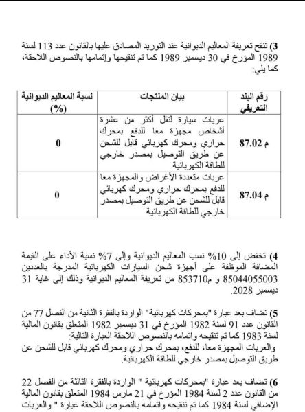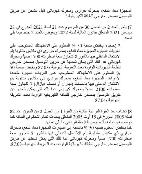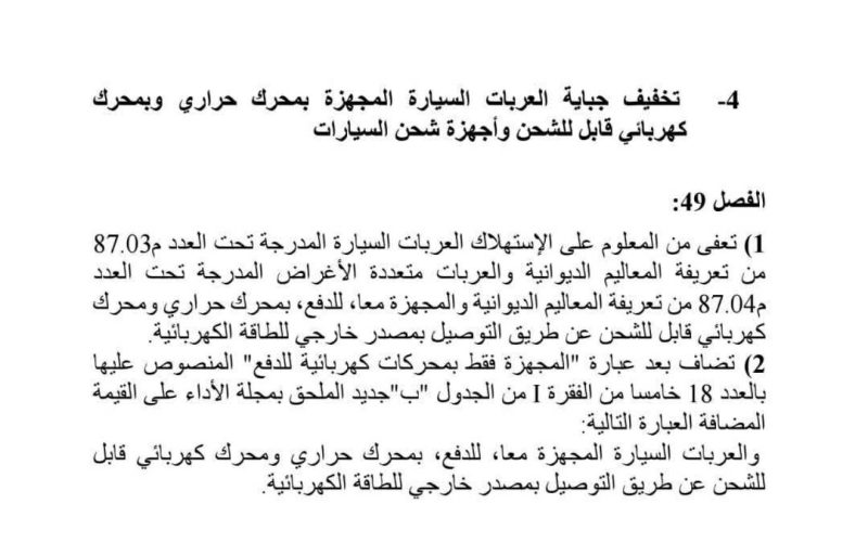 وطنية: تخفيف جباية العربات السيارة المجهزة بمحرك كهربائي وبمحرك حراري قابل للشحن أو أجهزة شحن السيارات.