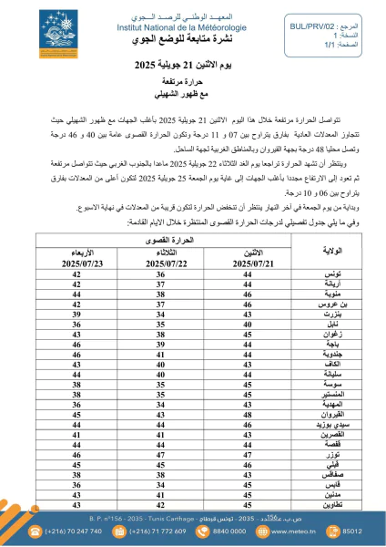 نشر المعهد الوطني للرصد الجوي اليوم الاثنين 21 جويلية 2025، نشرة متابعة بخصوص درجات الحرارة لـ3 أيام قادمة.