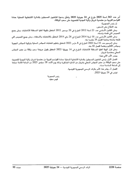 وطنية: نشر الأمر عدد 363 لسنة 2025 مؤرخ في 24 جويلية 2025 المتعلق بدعوة الناخبين المسجلين بالدائرة الانتخابية المحلية عمادة القواسم الغربية من معتمدية شربان ولاية المهدية للتصويت على عريضة سحب وكالة، بالرائد الرسمي للجمهورية التونسية عدد 95 بتاريخ 24 جويلية 2025