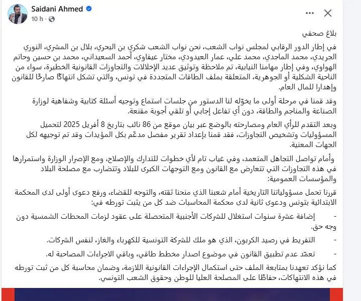 وطنية: أعلن عدد من نواب مجلس الشعب صباح اليوم السبت 16 أوت 2025 اعتزامهم تقديم قضايا لدى المحكمة الابتدائية بتونس و محكمة المحاسبات ضد من وصفه النواب بكل من "يثبت تورطه في إضافة عشرة سنوات استغلال للشركات الأجنبية المتحصلة على عقود لزمات المحطات الشمسية دون وجه حق"