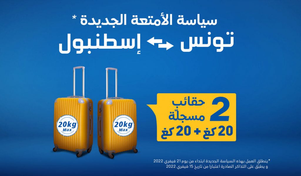 وطبقا لهذه السياسة الجديدة لخدمات الامتعة يتمتع المسافرون على الخط الرابط بين تونس واسطنبول بإمكانية تسجيل حقيبتين، الوزن الأقصى لكلّ واحدة منهما 20 كلغ. إضافة إلى حقيبة واحدة في المقصورة وزنها الأقصى 8 كلغ.