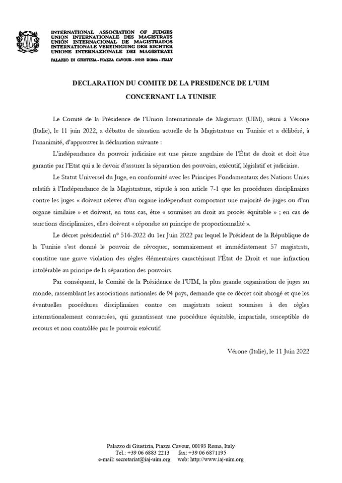 تبنت هيئة الرؤساء للإتحاد الدولي للقضاة المجتمعة بفيرونا الايطالية في بيان صادر عنها بتاريخ 11 جوان 2022 قرارا بالاجماع برفض إعفاء القضاة بتونس.